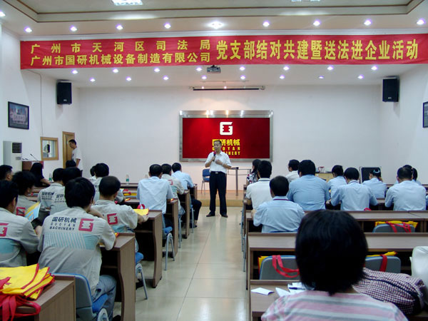 9月7日下午,广州市天河区司法局党支部和文教工作队一行18人在局长罗育辉和副局长曾晓云的带领下,来到广州市国研机械设备制造有限公司举行党支部结对共建暨送法进企业活动。