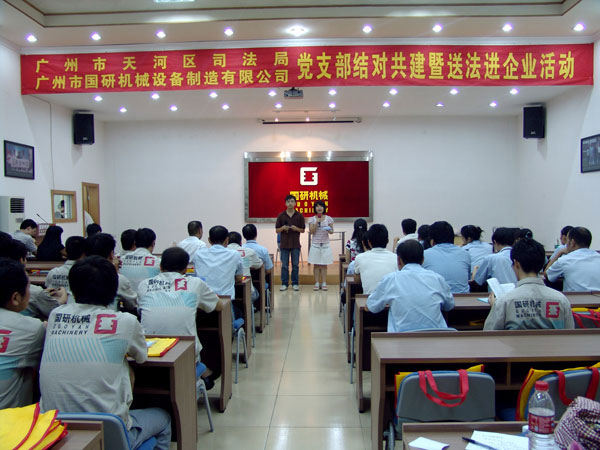 9月7日下午,广州市天河区司法局党支部和文教工作队一行18人在局长罗育辉和副局长曾晓云的带领下,来到广州市国研机械设备制造有限公司举行党支部结对共建暨送法进企业活动。